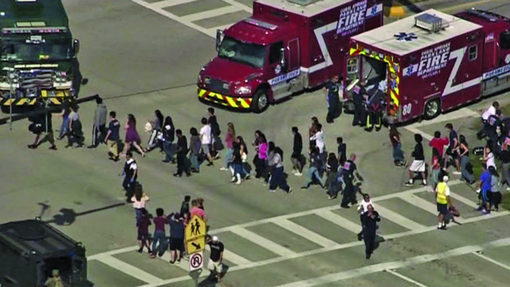 Students are evacuated from Marjory Stoneman Douglas High School during a shooting incident in Parkland, Florida, Feb. 14 – Photo by Reuters