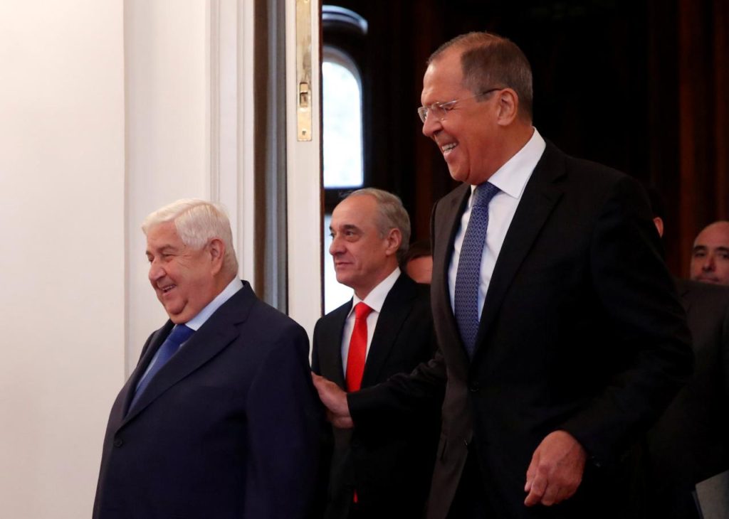 Russian Foreign Minister Sergei Lavrov and Syrian Foreign Minister Walid al-Moualem enter a hall for their talks in Moscow, Russia August 30, 2018. – REUTERS