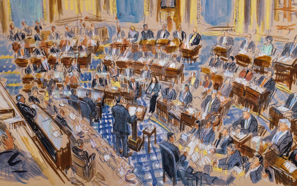An artist’s sketch of Wednesday’s trial proceedings.