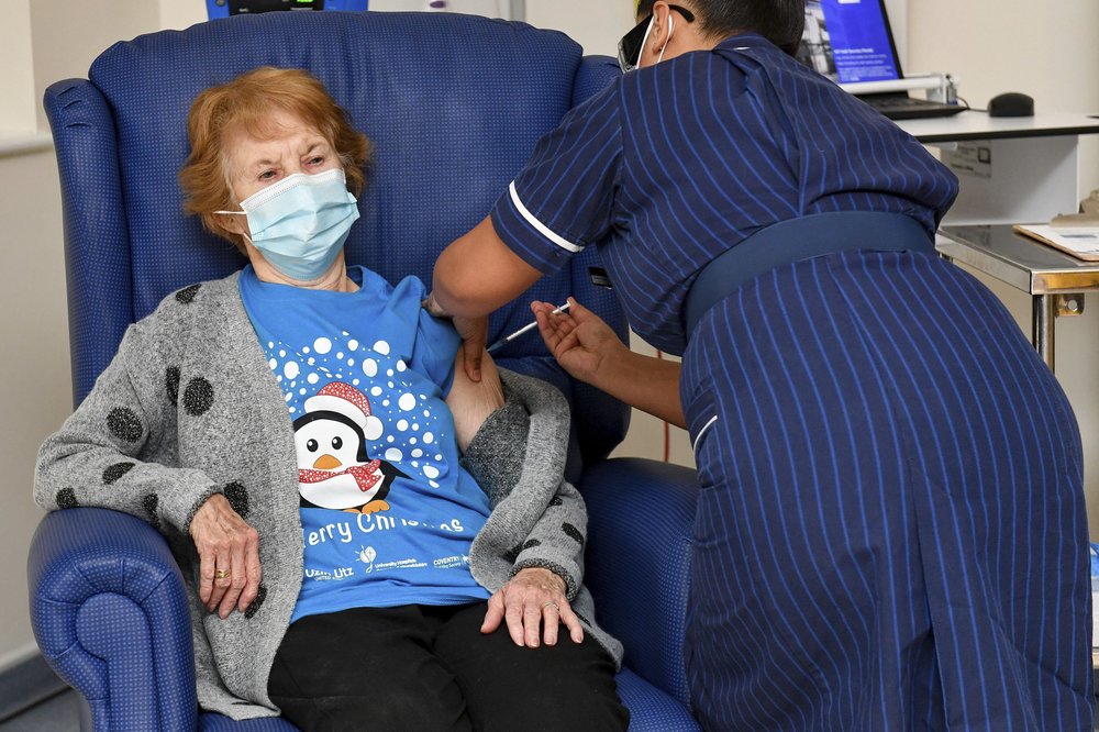 Margaret Keenan, 90, becomes the first person in the world, outside of a trial, to receive the Pfizer/BioNTech COVID-19 vaccine. The injection was administered by nurse May Parsons at University Hospital, Coventry, England, Tuesday Dec. 8. Photo: Jacob King