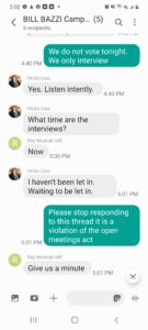 During the Council meeting, text messages that had transpired after the first vote on a Council member appointment were read aloud.
