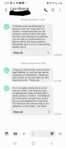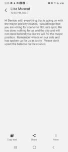 “Hi Denise, with everything that is going on with the mayor and City Council, I would hope that you are voting for Zouher to fill Lisa’s spot,” the text from Lisa Muscat received on Dec. 7 read. “Mo has done nothing for us and the city and will not stand behind you like we will for the mayor position. Remember who is on our side and has spoken up for us as a city. Please don’t upset the balance on the Council.”