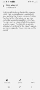 Screenshot of a text message sent from Lisa Muscat to Malinowski-Maxwell prior to the City Council meeting on Dec. 8