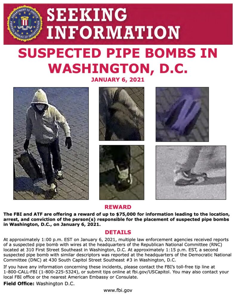 “ADDITIONAL REWARD: @ATFWashington & #FBIWFO are now offering a reward of up to $75K for info about the person(s) responsible for the placement of suspected pipe bombs in DC on January 6th,” the tweet said. “Call 1800CALLFBI with info or submit to //fbi.gov/USCapitol.”