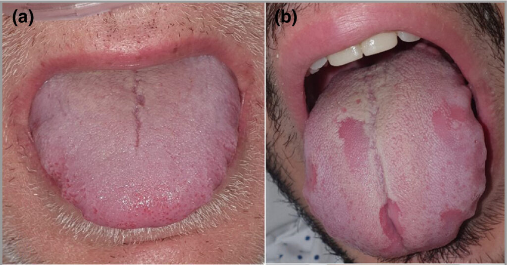 The letter even includes photos, so you can see close-ups of (a) a swollen COVID tongue and (b) a patchy, bumpy COVID tongue. Photo: British Journal of Dermatology