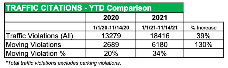 The department recorded 13,279 total traffic violations from the beginning of last year to mid-November this year. Those violations are up to 18,416 for the same period in 2021, a 39 percent increase. Total traffic violations exclude parking violations.