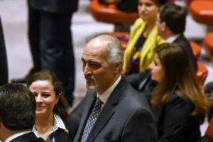 Syrian Arab Republic Ambassador to the United Nations Bashar Jaafari arrives at a the Security Council meeting on the situation in Syria at the United Nations Headquarters in New York, U.S., April 12, 2017. REUTERS/Stephanie Keith