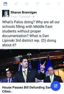 “What’s Palos doing?” Brannigan asked on the Facebook page that began the mobilization efforts for her resignation. “Why are all our schools filling with Middle East students without proper documentation? What is Dan Lipinski Third District [Congressional] rep. (D) doing about it?”