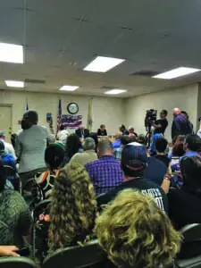Community members took turns sharing their opinions at the township rally. Hundreds were lined up to speak at the township meeting inside the hall, which could only hold 40 people at a time