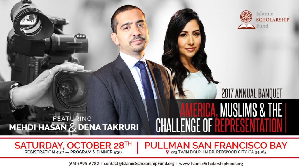 This year, the banquet falls on October 28. It will take place at the Pullman San Francisco Bay in Redwood City, CA and the keynote speakers will be Mehdi Hasan of Al Jazeera and Dena Takruri of AJ+.