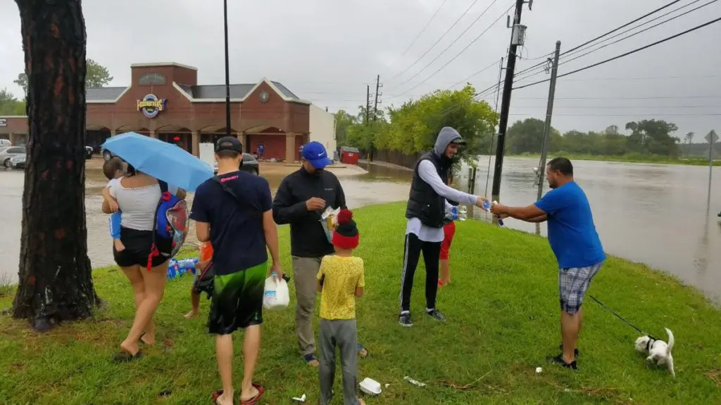 Young Muslim volunteers at a flooded parking assisting hurricane victims