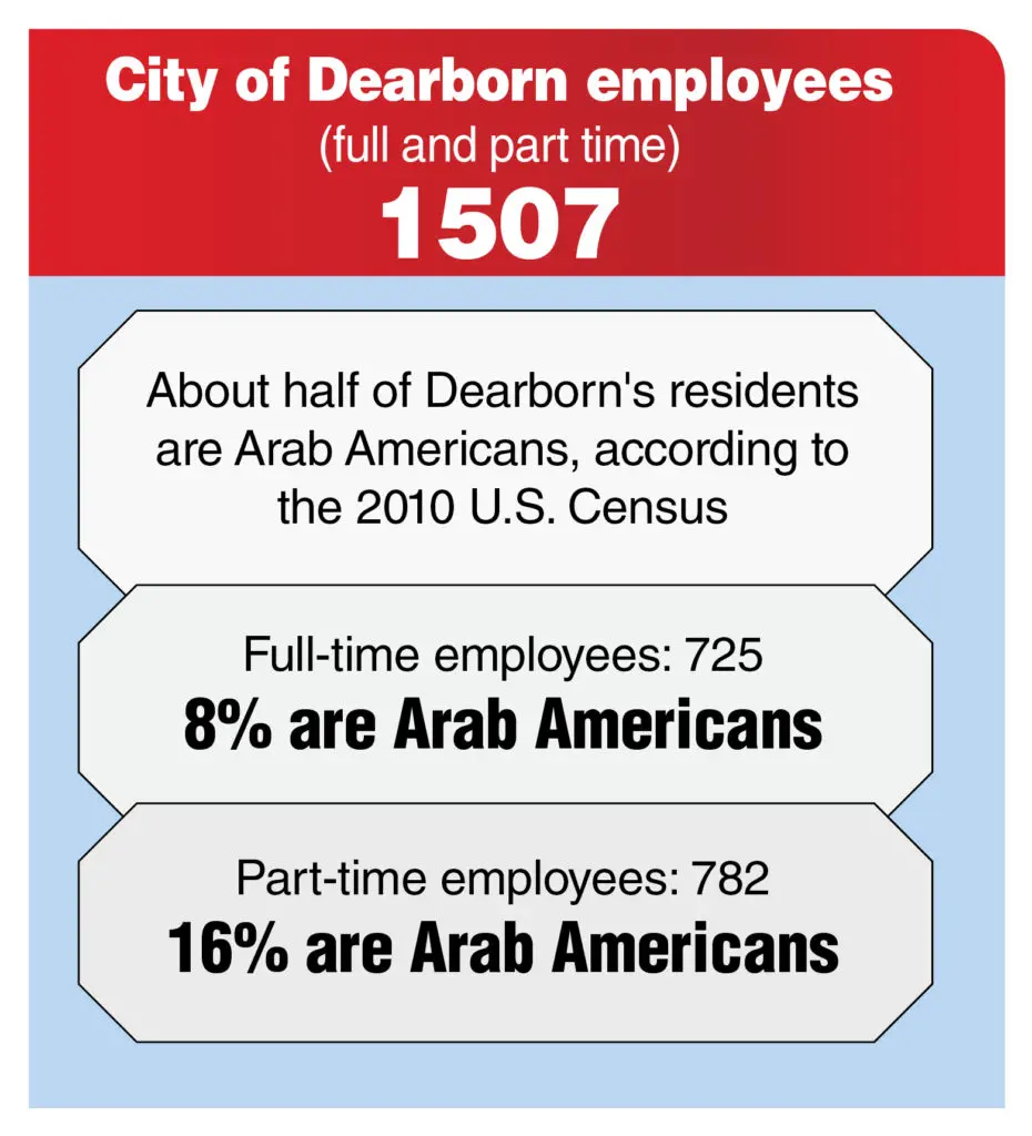 About 8 percent of the city’s 725 full-time employees are Arab Americans. Of part-time workers, 16 percent are Arab Americans.