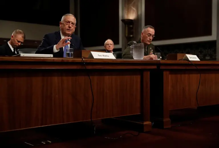 Secretary of Defense James Mattis, accompanied by Chairman of the Joint Chiefs of Staff General Joseph Dunford, testifies before a Senate Armed Services Committee hearing on the “Political and Security Situation in Afghanistan” on Capitol Hill in Washington, U.S., October 3, 2017. REUTERS