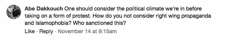“One should consider the political climate we’re in before taking on a form of protest,” said Abe Dakkoush, an Arlington, Texas-based attorney originally from Dearborn. “How do you not consider right wing propaganda and Islamophobia? Who sanctioned this?”