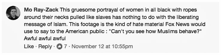Facebook user Mo Ray-Zack commented, “This gruesome portrayal of women in all black with ropes around their necks pulled like slaves has nothing to do with the liberating message of Islam. This footage is the kind of hate material Fox News would use to say to the American public: ‘Can’t you see how Muslims behave?'”