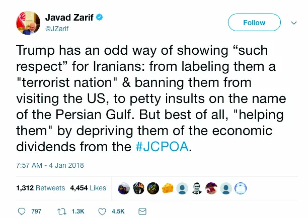 In a Thursday tweet, Iranian Foreign Minister Javad Zarif hit back at the White House for what he cast as duplicitous comments. Among them: Labeling Iran a “terrorist nation”, denying its citizens entry into the United States and Trump saying he respected Iranians while denying them the benefits of the Joint Comprehensive Plan of Action, which is aimed at ensuring Iran’s nuclear program is pursued for only peaceful ends.