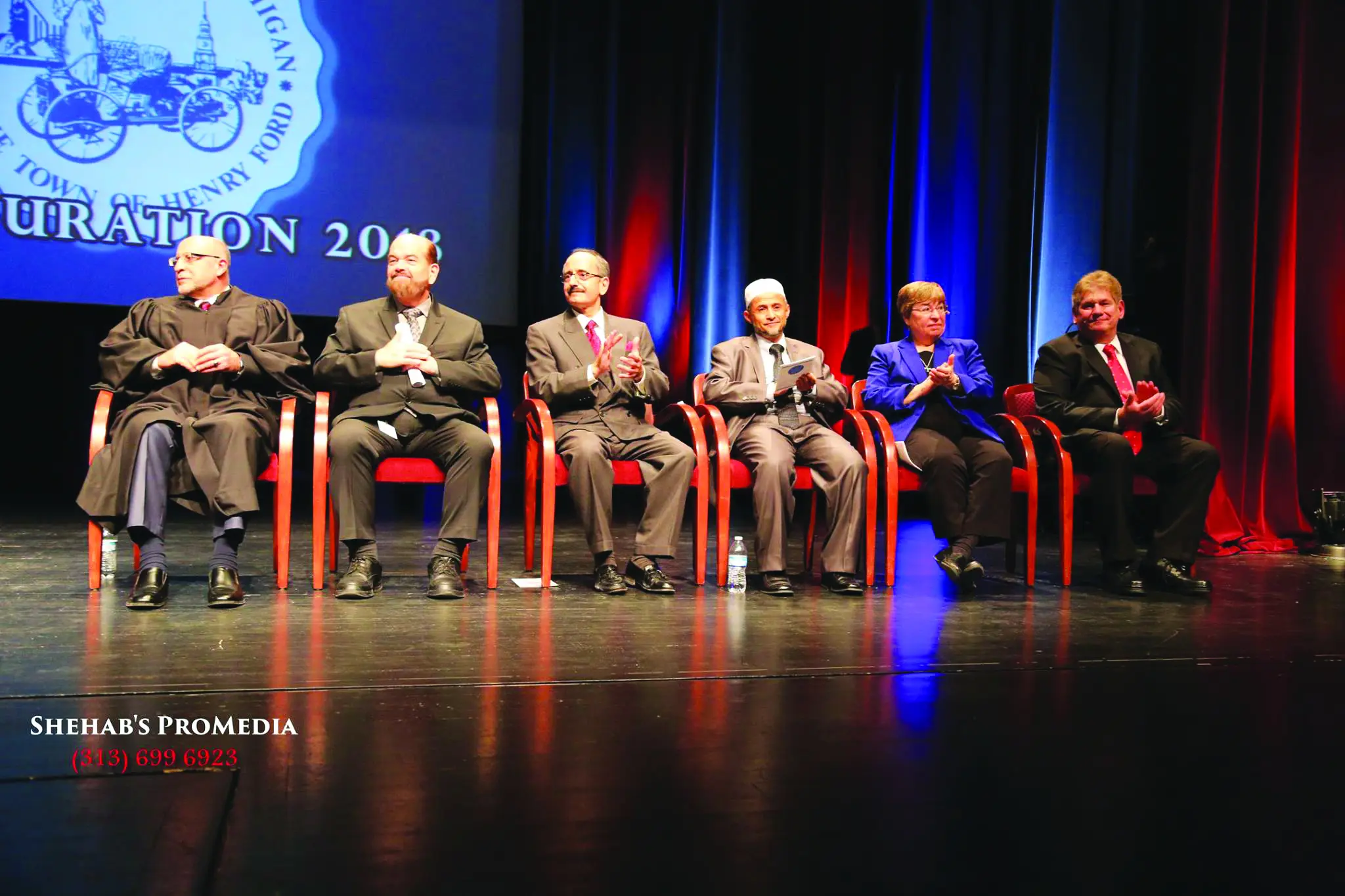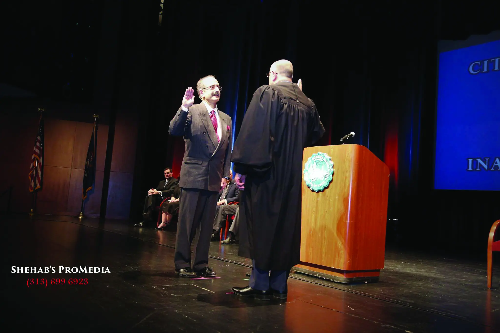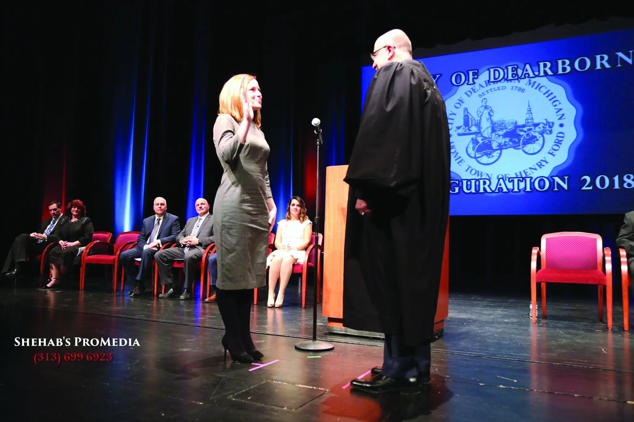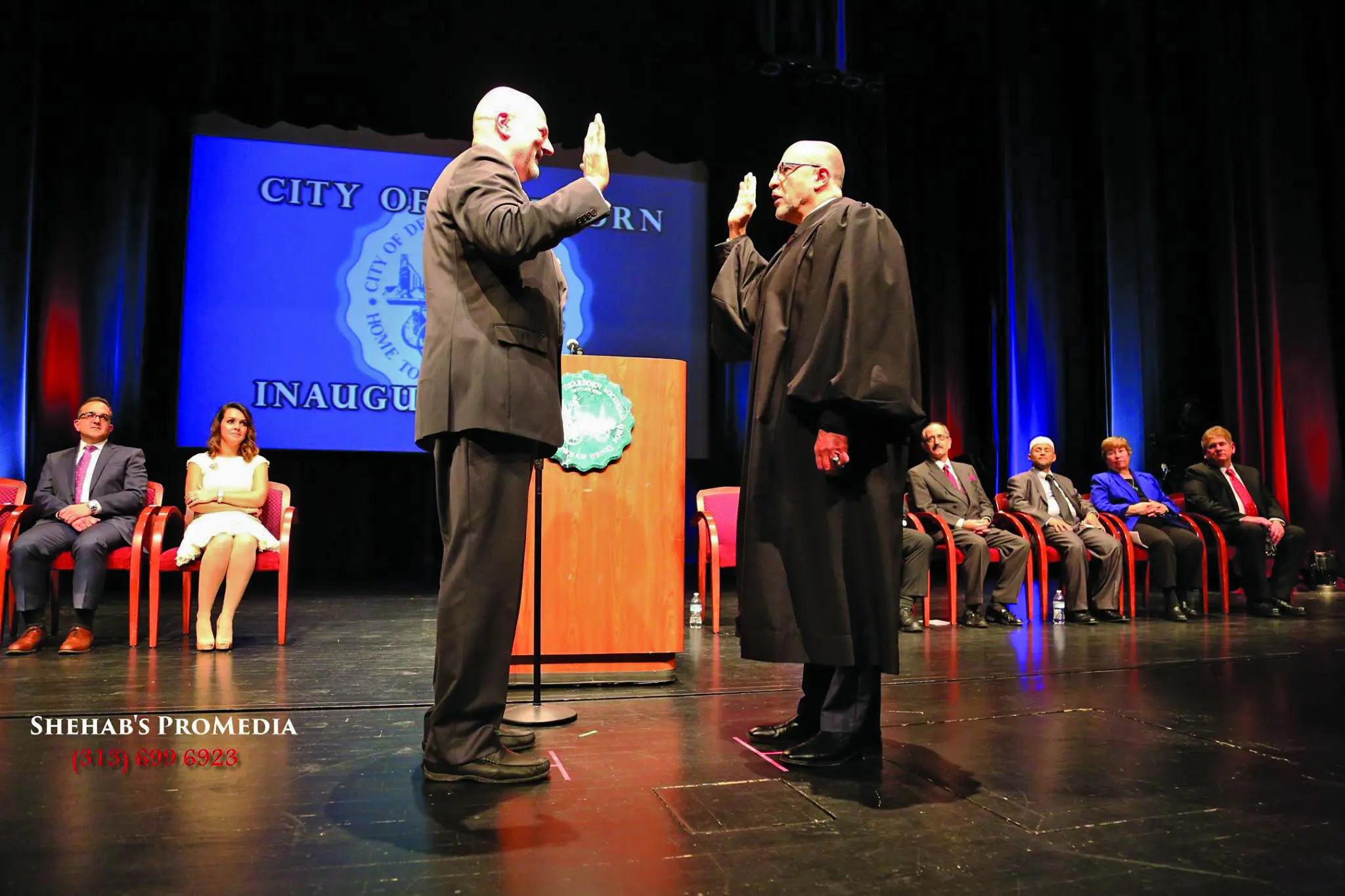Chief Judge Sam Salamey of the 19th District Court administrated the oath of office to O’Reilly, City Clerk George Darany, City Council President Susan A. Dabaja, Council President Pro Tem Michael T. Sareini and City Council members Robert A. Abraham, David Bazzy, Erin Byrnes, Leslie Herrick and Brian C. O’Donnell in the Ford Community and Performing Arts Center’s Michael A. Guido Theater.