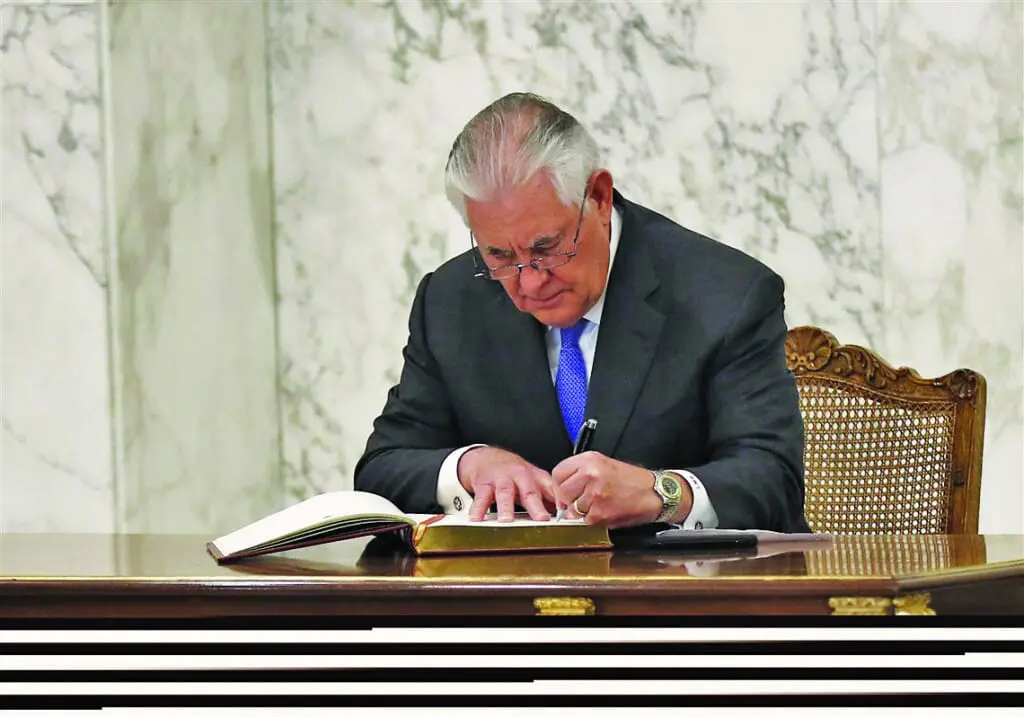 Secretary of State Rex Tillerson signs a guest book after his meeting with the Lebanese president: “Mr President, thank you for the warm welcome and the open, frank and productive discussion,” Tillerson wrote in the Lebanese palace’s visitors book after the talks. “The United States stands with the Lebanese people for a free and democratic Lebanon.”