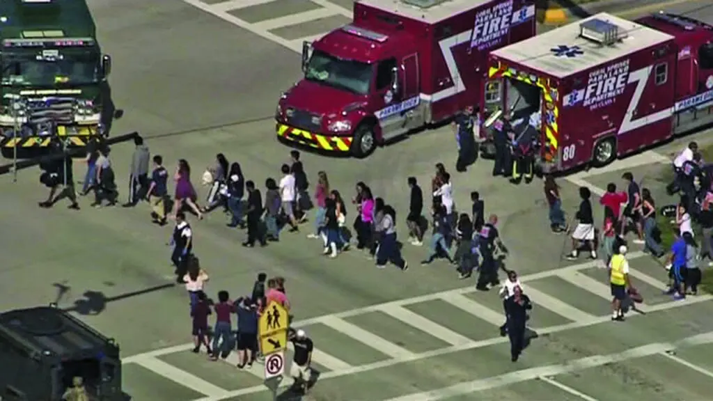 Students are evacuated from Marjory Stoneman Douglas High School during a shooting incident in Parkland, Florida, Feb. 14 – Photo by Reuters