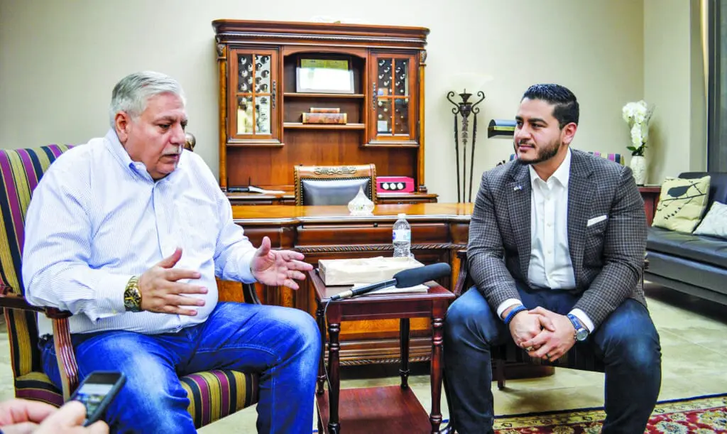Publisher Osama Siblani speaks to El-Sayed during an interview at The AANews, February 28 – Photo by The AANews