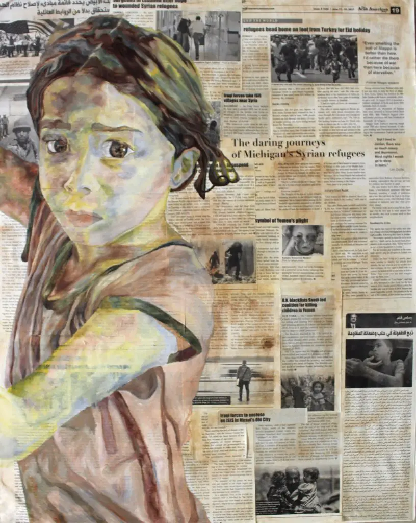 A painting of that refugee girl over a canvas of newspaper clippings about the struggles of Syrian refugees in Michigan and around the world, now hangs at an exhibit with paintings by other students in her age group at the College for Creative Studies.