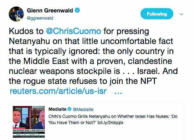 As The Intercept’s Glenn Greenwald noted in response to the exchange between Cuomo and Netanyahu, the inconvenient fact that Israel continues to shroud its own nuclear stockpile in secrecy as it levels accusations against Iran— which, unlike Israel, allows inspectors to examine its nuclear facilities to ensure they’re being used for peaceful purposes— is “typically ignored” by America’s corporate media outlets.