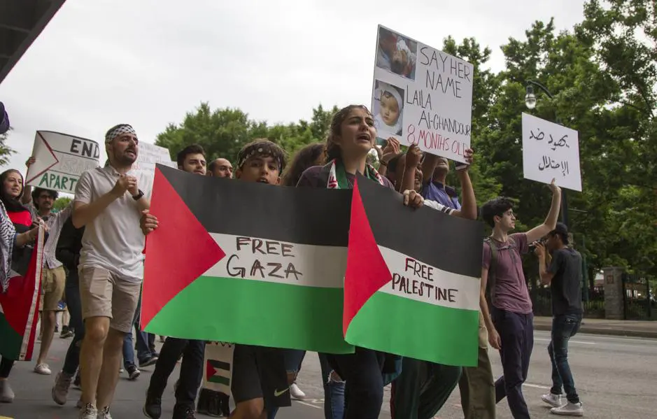 ATLANTA — It began with the raising of large red, green and black flags which waved to the sound of booming chants: “From the river, to the sea, Palestine will be free!”