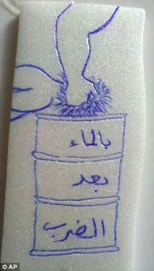 This undated photo obtained by The Associated Press shows a drawing of a prisoner being abused at a prison in Yemen run by the United Arab Emirates. Arabic from right to left reads: “Anti-terrorism”, “Innocent citizen” and “Real terrorism behind their back, they don’t look at.” The AP has identified at least five secret prisons run by the UAE, a key U.S. ally, where security forces use sexual torture to brutalize and break inmates. (AP photo)