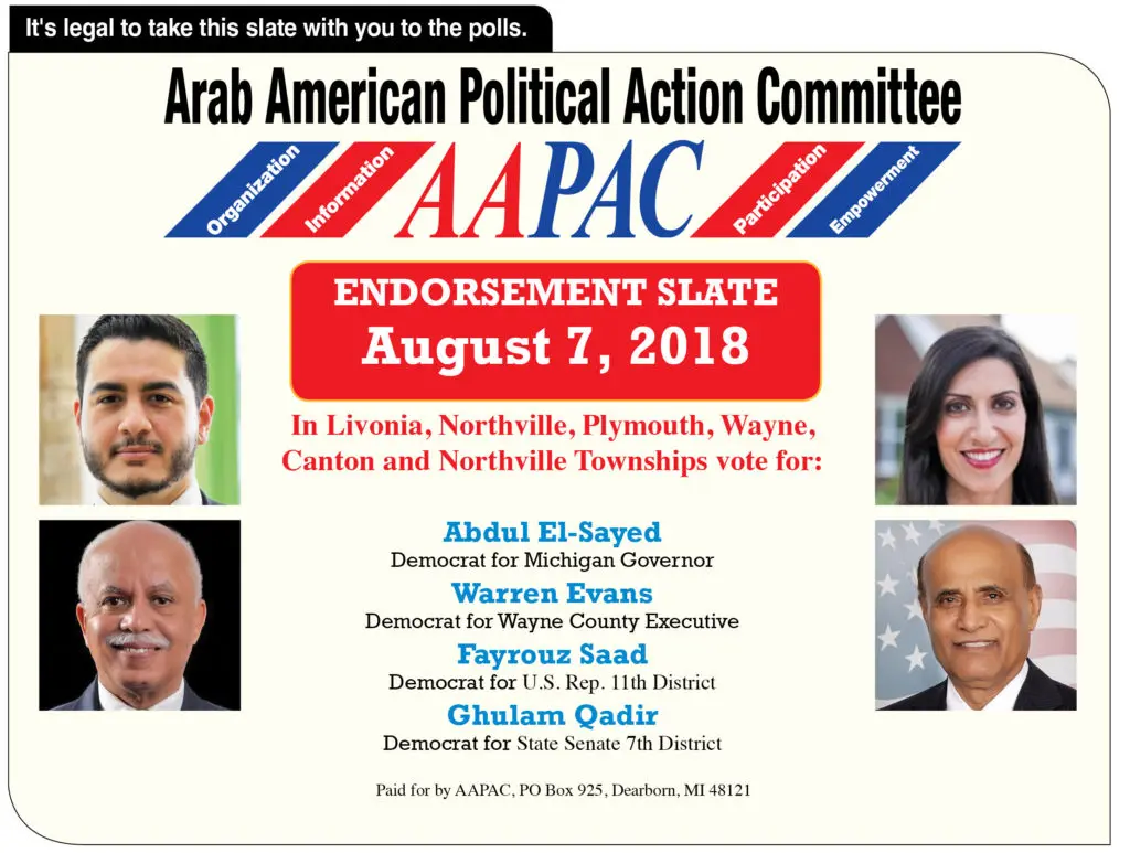 After interviews and deliberations on August 1, The Arab American Political Action Committee (AAPAC) endorsed candidates for state representative, state senator, Wayne County executive and a judge on the Wayne County Probate Court. Its members sought to give young and new candidates an opportunity to bring about change and to bring Arab American issues to the table in local and state governmental institutions.