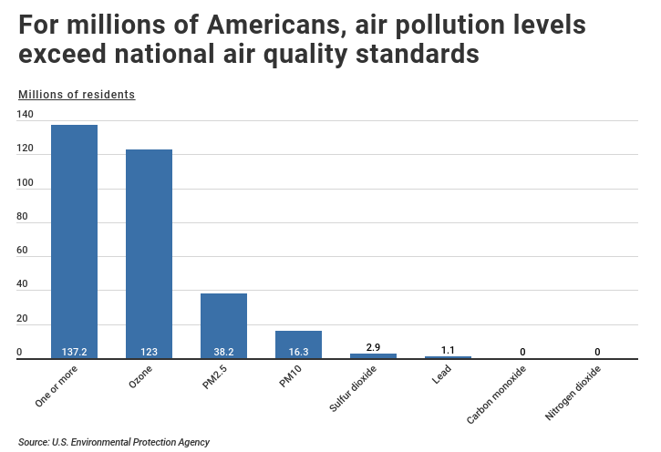 For more than 137 million Americans, air pollution levels exceed national standards with the most common pollutant being ozone (Source U.S. Environmental Protection Agency).