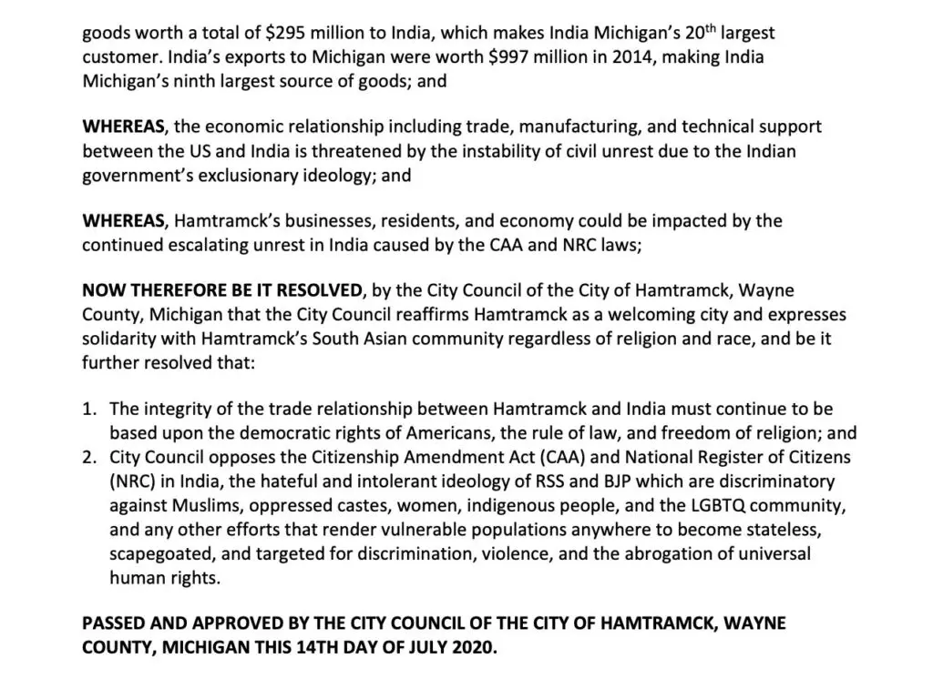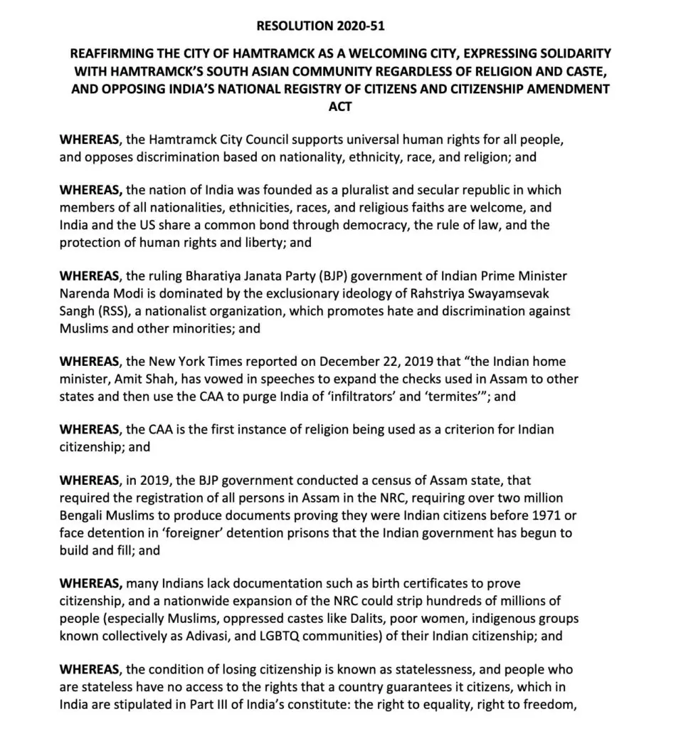 HAMTRAMCK — The Hamtramck City Council passed a resolution on Tuesday denouncing the discriminatory Citizenship Amendment Act (CAA), which took effect in India last December, making it the fifth U.S. city to make such a stand against India’s widely criticized new law.