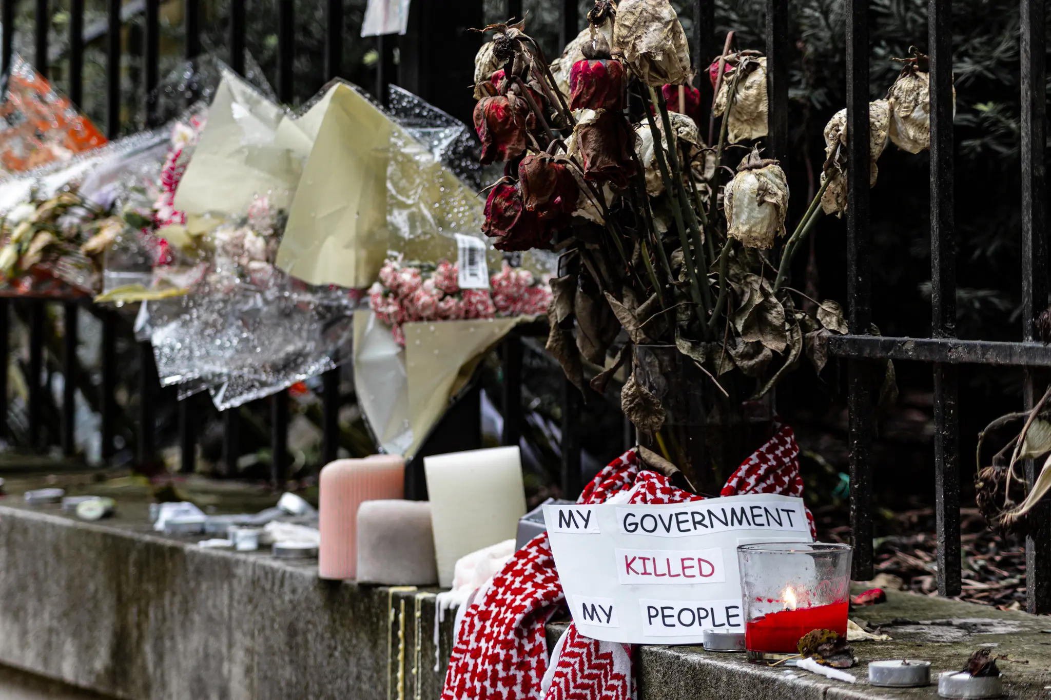 Compared to the demonstrations held last year at the height of the October revolution, Sunday’s protest had a subdued atmosphere. Attendees held signs beyond the embassy gates, where wilting flowers and faded photographs lay from a past memorial. The Lebanese flag swayed at half-mast above a chattering crowd sharing stories and thoughts about the way forward.