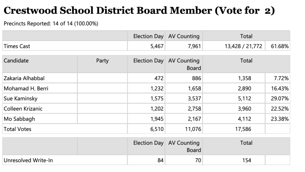 In Dearborn Heights’ Crestwood School District, incumbent Sue Kaminsky (5,112 votes) and newcomer Mo Sabbagh (4,112 votes) were elected to the school board.