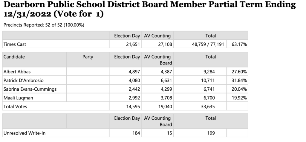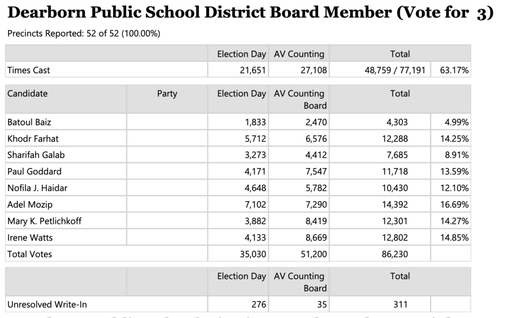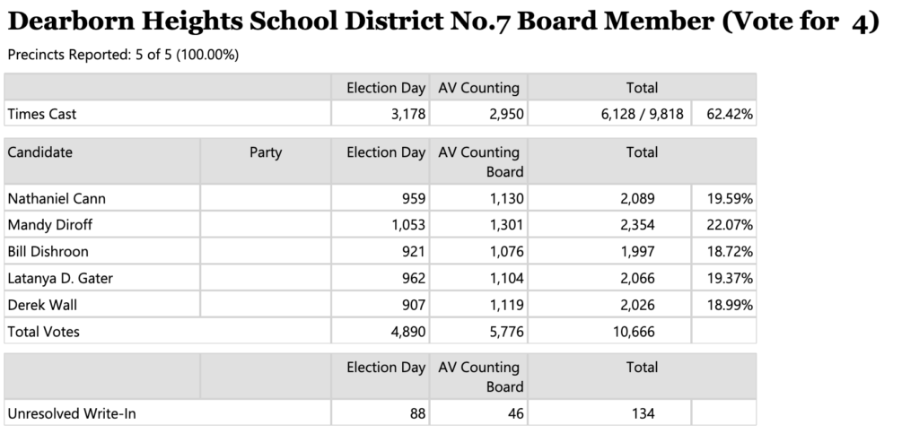 In Dearborn, Adel Mozip(14,356 votes), Irene Watts (12,781 votes) and Mary Petlichkoff (12,278 votes) were each elected to the full term seats on the Board of Education, with Patrick D’Ambrosio (10,694 votes) being elected for the partial term.