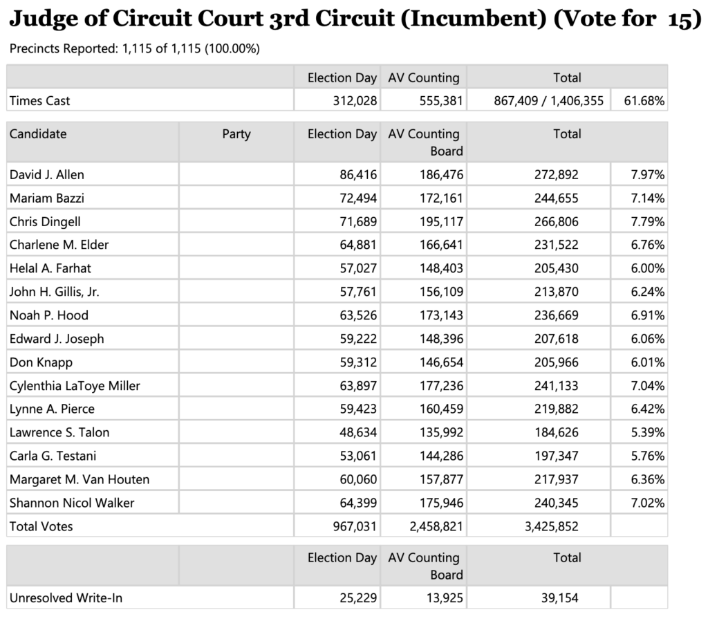 In the Wayne County Circuit Court — Incumbents, four of the top vote getters were Arab Americans. The top vote getter was Judge David Allen, second top vote getter was Judge Mariam Bazzi and fourth was Judge Charlene Elder, while Judge Helal Farhat came in fifth place among the 15 incumbent judges who retained their seats.