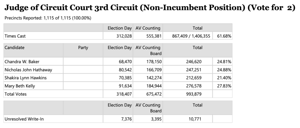 In the Wayne County Circuit Court — Non incumbent race, Mary Beth Kelly returned to the bench after previously serving as a justice on the Michigan Supreme Court, with (276,578 votes) and newcomer Nicholas John Hathaway won the second open seat and received (247,251 votes).