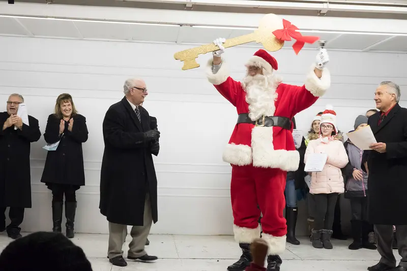 Mayor Dan Paletko giving the key to the city to Santa during an annual tree lighting ceremony
