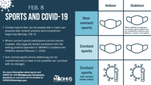 Effective Feb. 8, contact sports can resume provided masks are worn during practices and competition.