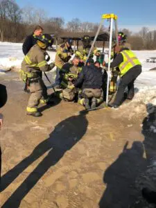 department was able to lower a person down to attach a harness to the dog and then they both were lifted out. The owner was anxiously waiting and was thrilled with the dog’s rescue and the dog was equally happy.”