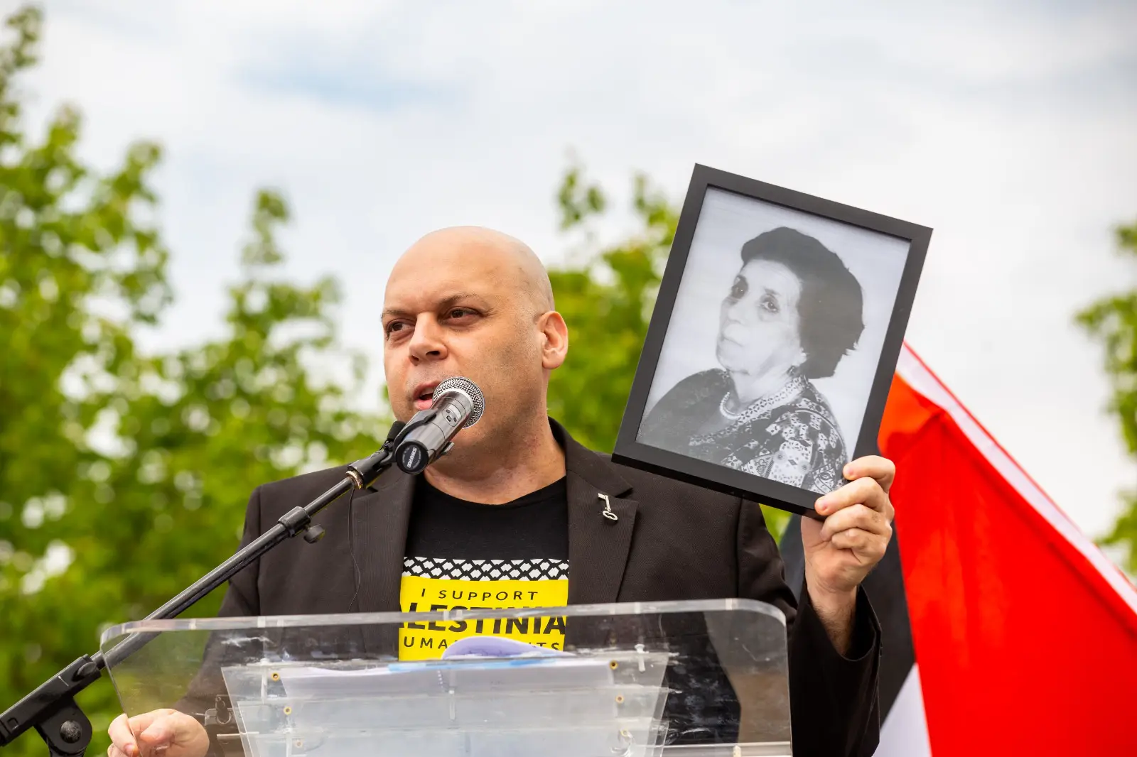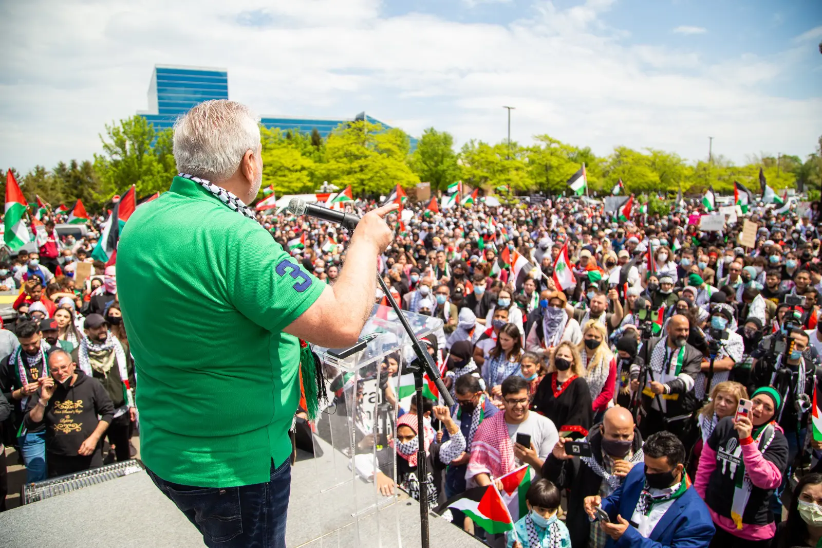 NGP President Amer Zahr spoke from a microphone on a stage, addressing the massive crowd.