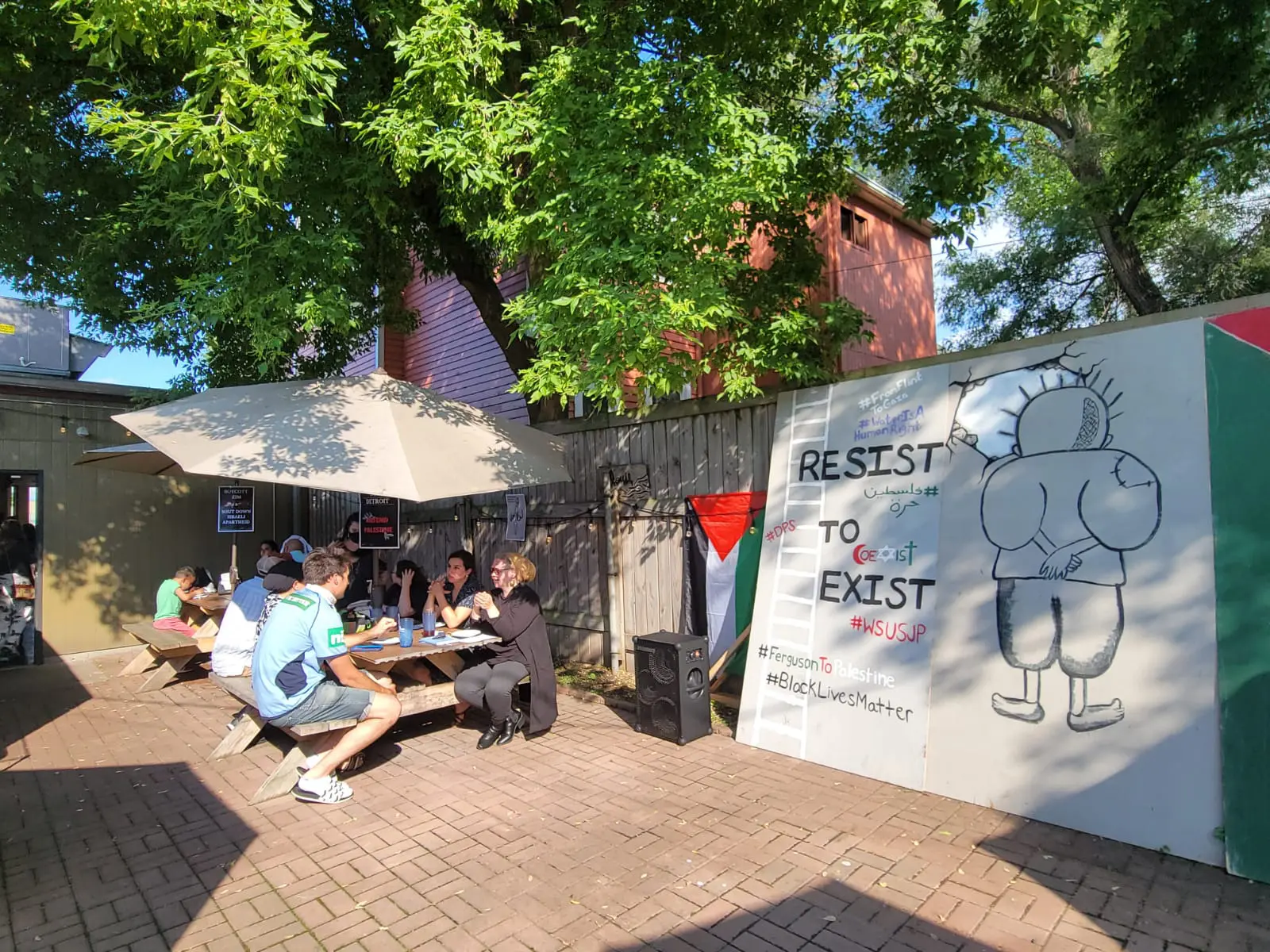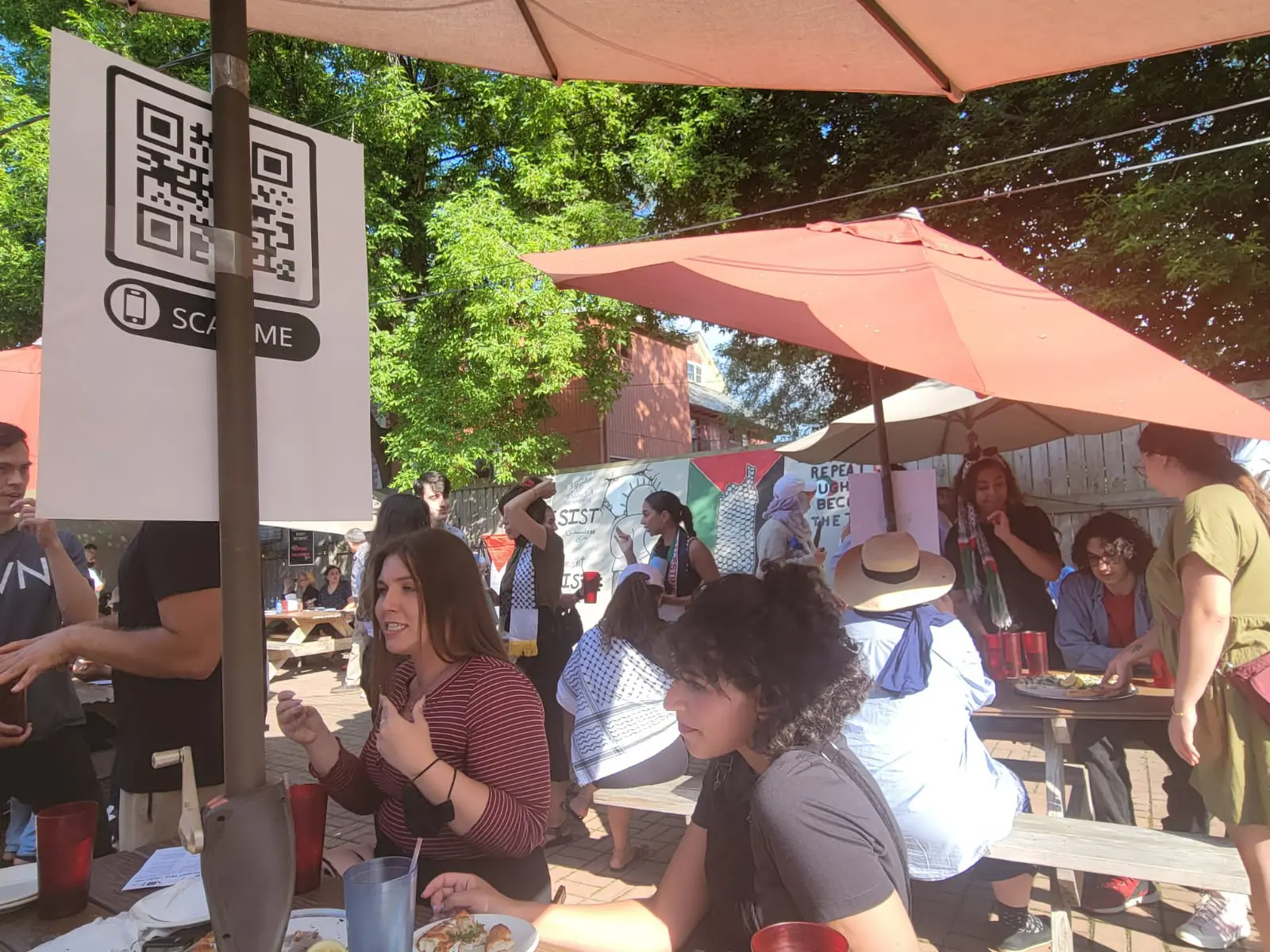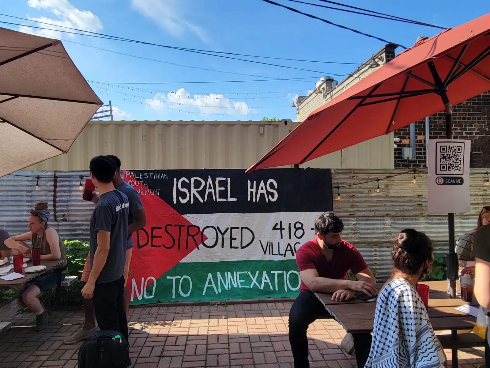 On Wednesday afternoon, Pie-Sci hosted a “Pizza and Palestine conversations over pie” event. The event was attended by some two dozen people in the pizzeria’s back patio, where posters, banners and informational flyers surrounded the open space. Arabic music played over a speaker as attendees gathered and enjoyed the specialty pizza.