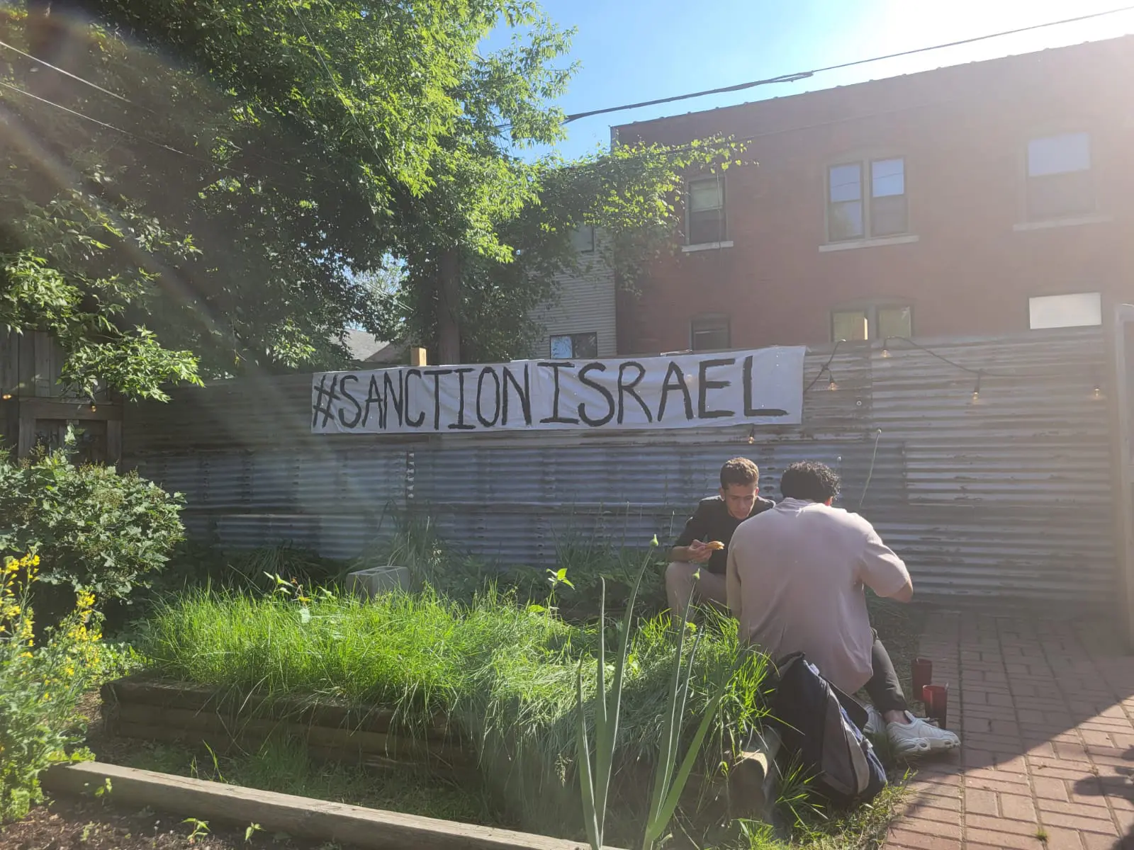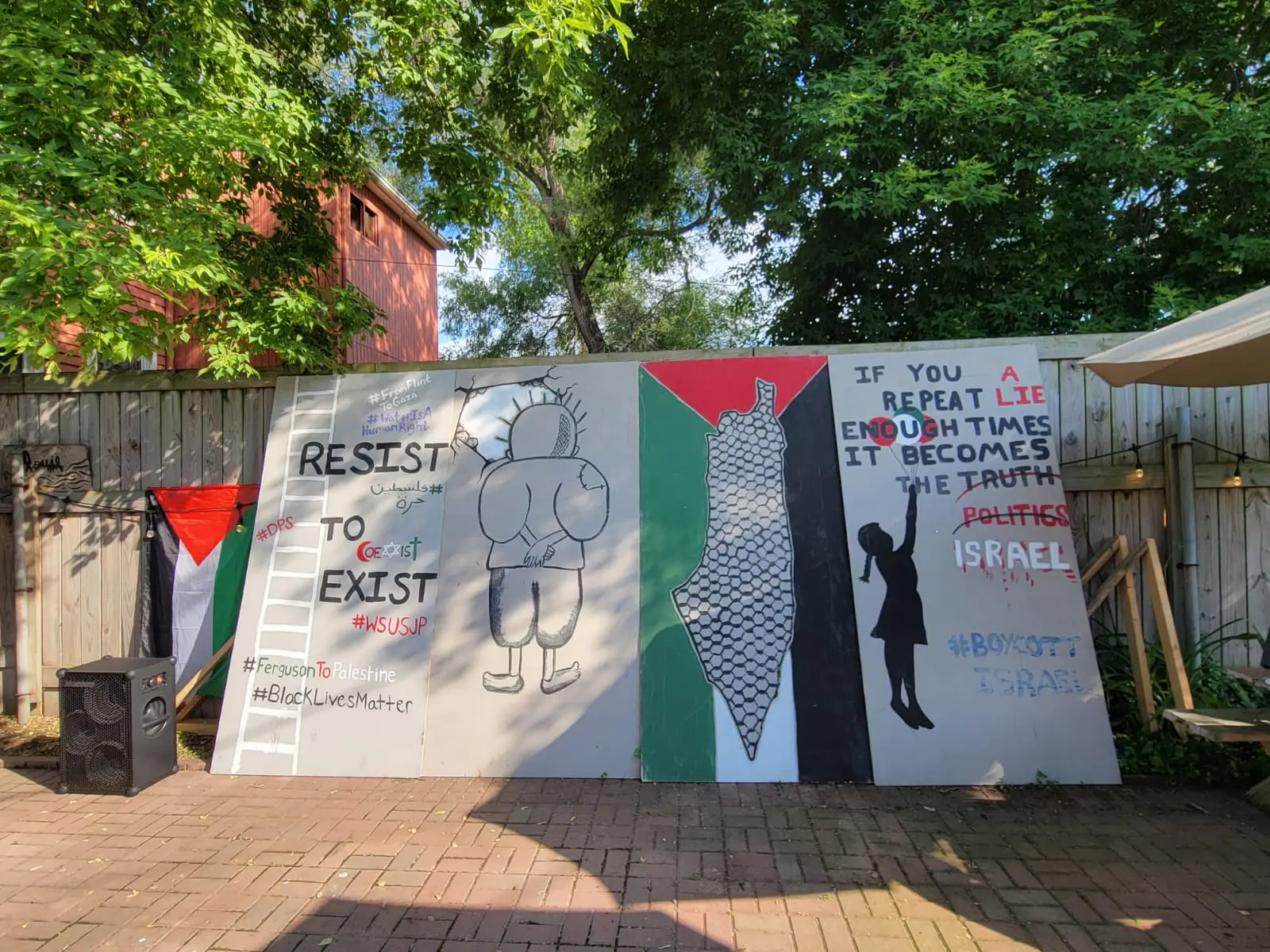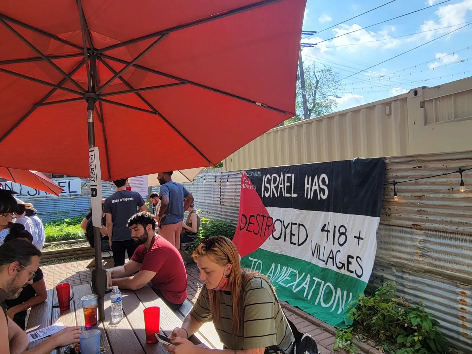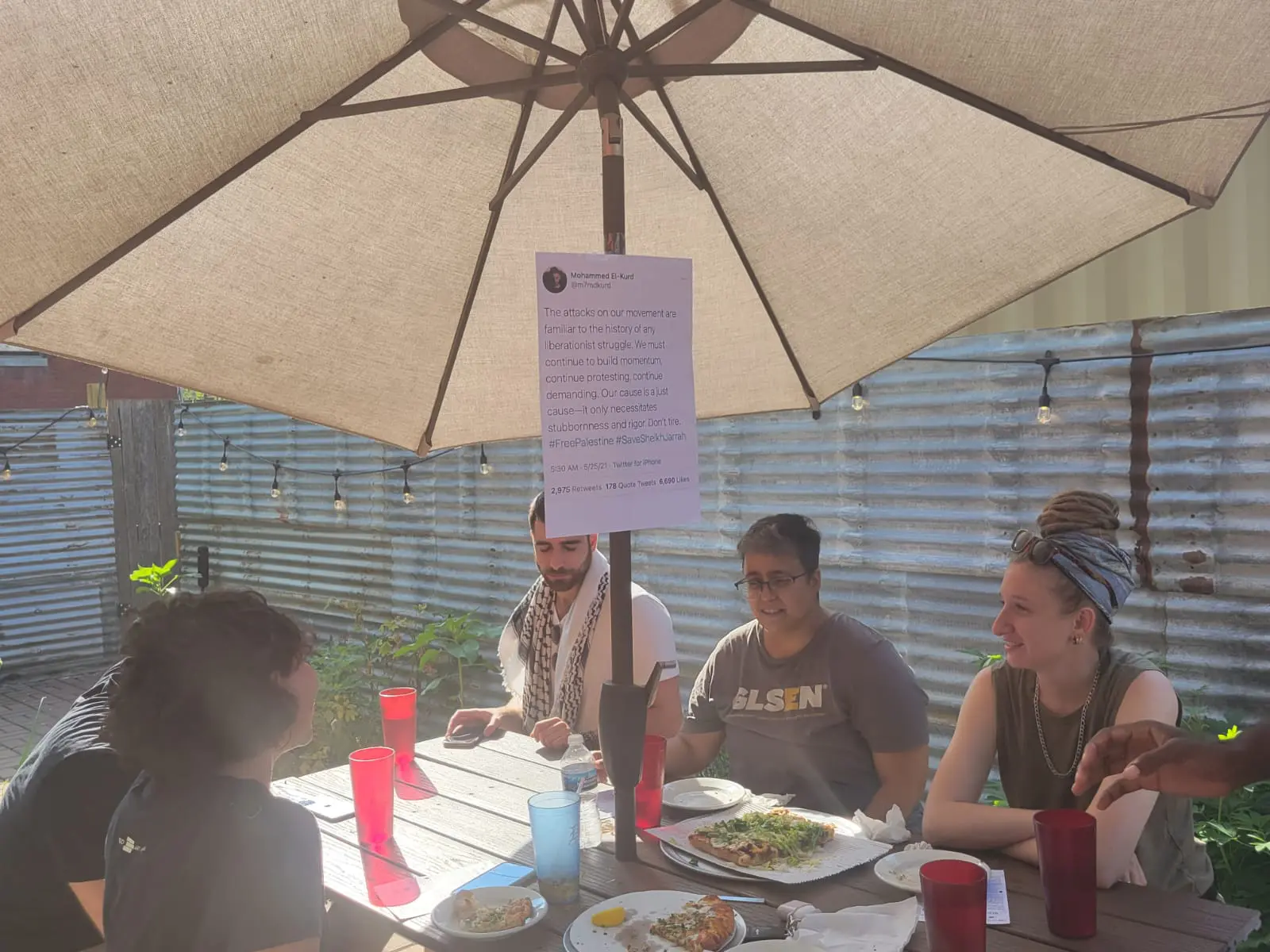 On Wednesday afternoon, Pie-Sci hosted a “Pizza and Palestine conversations over pie” event. The event was attended by some two dozen people in the pizzeria’s back patio, where posters, banners and informational flyers surrounded the open space. Arabic music played over a speaker as attendees gathered and enjoyed the specialty pizza.