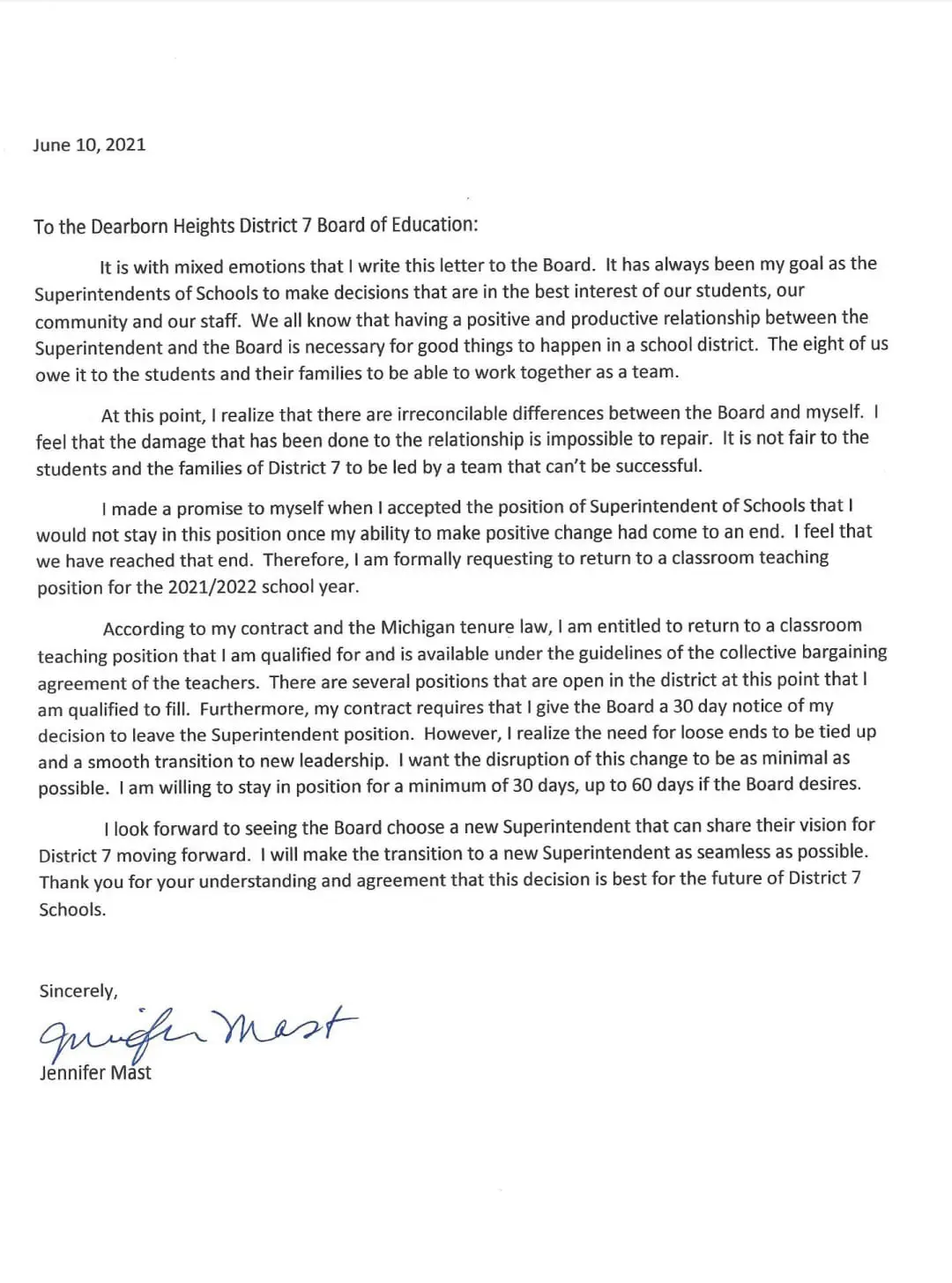 The letter to the board went on to say that Mast had made a promise to herself to not stay in the position when she felt as though she could no longer make positive change, and that she feels that time has come and she would like to return to teaching.