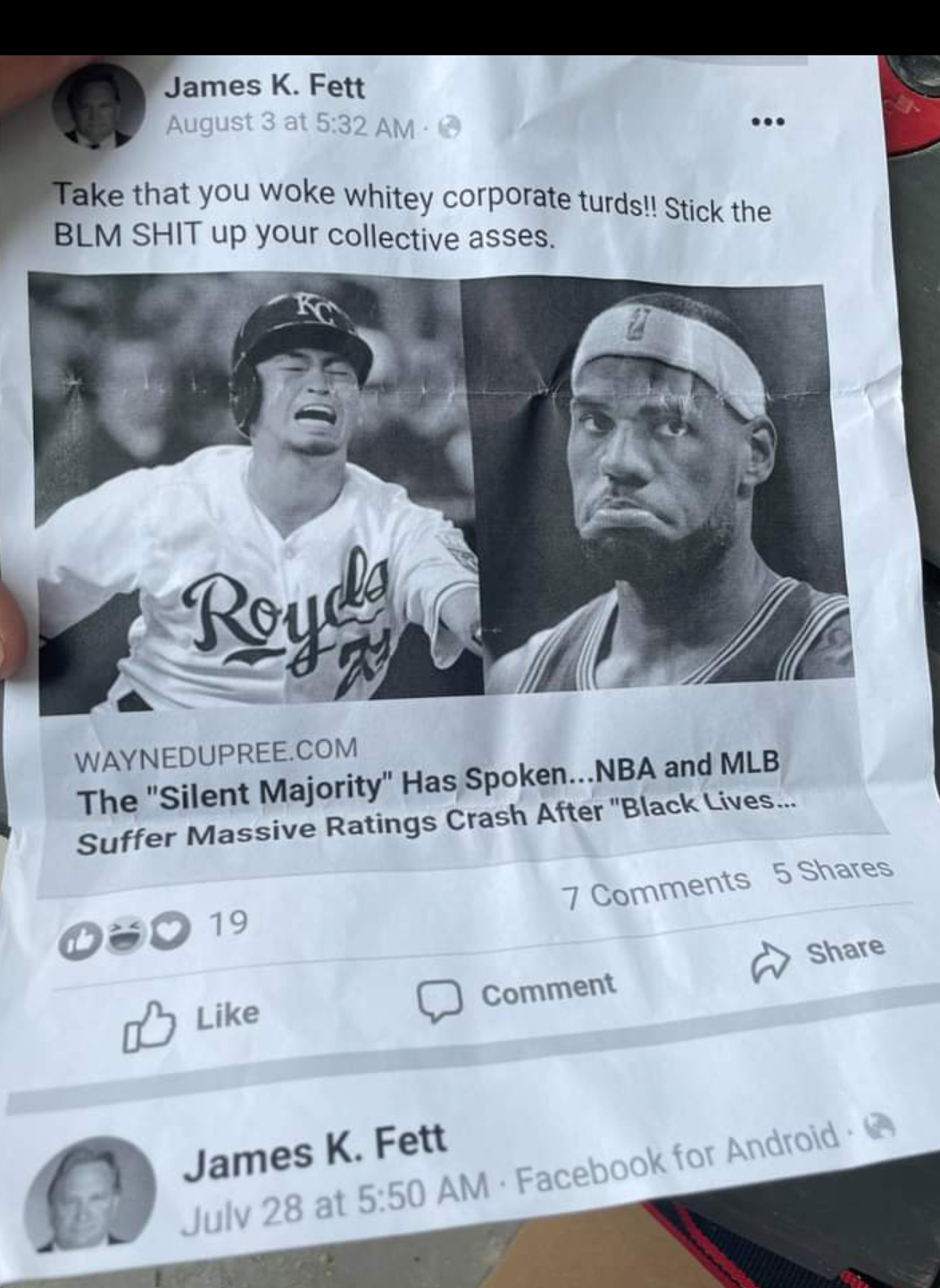 “I didn’t see your little Facebook post that you got, but I know one thing, I’m no racist,” he said. “But I do know something else, and my truth is this, BLM is a terrorist organization.”