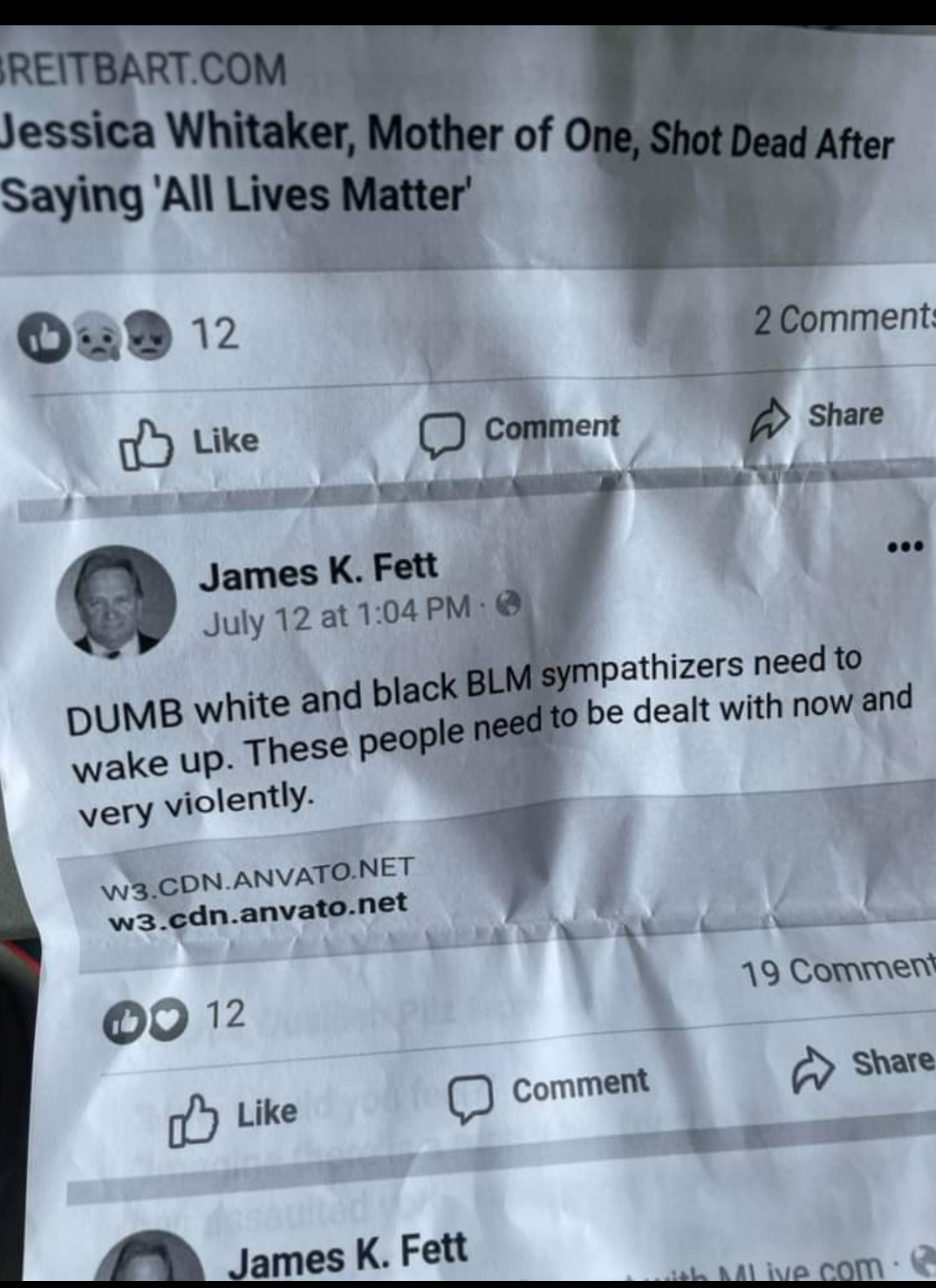 “He is not a racist” she said. “Opposition to BLM is not racism. Mr. Fett opposes BLM because he believes that they unfairly taint law enforcement, they are Marxists, they are corrupt and they ‘cancel’ people, including his clients. Mr. Fett did not threaten to shoot anybody, including Saab, who was at all times the aggressor picking a fight with a man 26 years his senior. Mr. Fett did not call anybody a ‘f—ing Arab’ and never would. All of this nonsense is because the mayor wishes to divert attention from his possible corruption.”