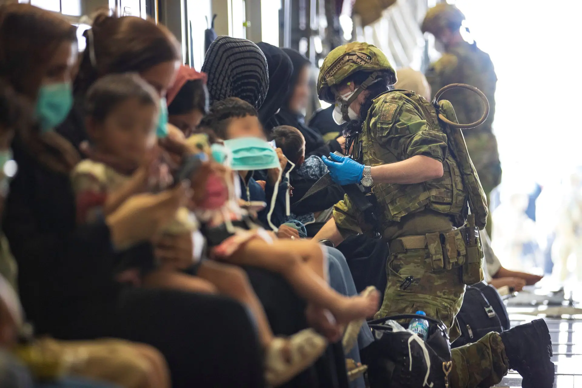 The Royal Australian Air Force Air Load Team assists evacuees into their seats on board the Royal Australian Air Force C-17A Globemaster III aircraft, prior to departing Hamid Karzai International Airport in Kabul, Afghanistan, August 22. Photo: SGT Glen McCarthy/Australia’s Department of Defense