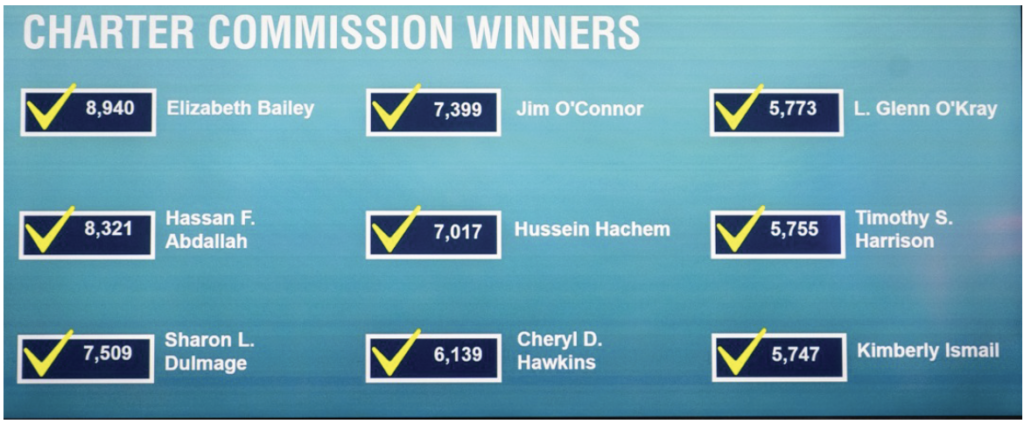 L Glenn O’Kray, Jim O’Connor, Cheryl Hawkins, Hussein Hachem, Timothy Harrison, Sharon Dulmage and Laura Dudgeon will make up the other seven seats of the Charter Commission.