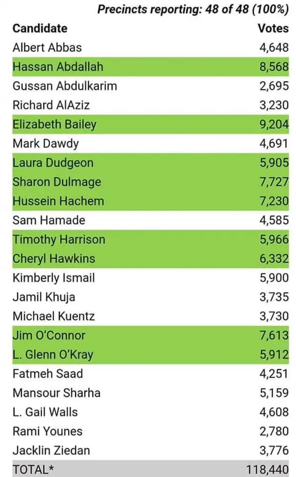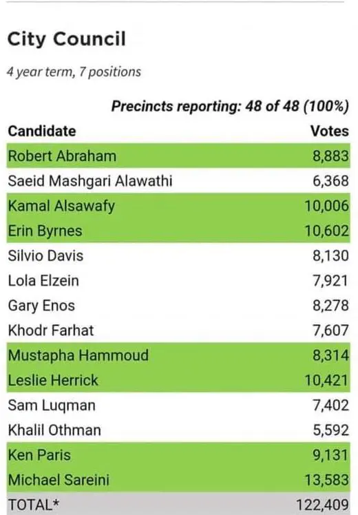 Kamal Alsawafy had 10,006 votes, Ken Paris had 9,131 votes and Mustapha Hammoud had 8,314 votes.