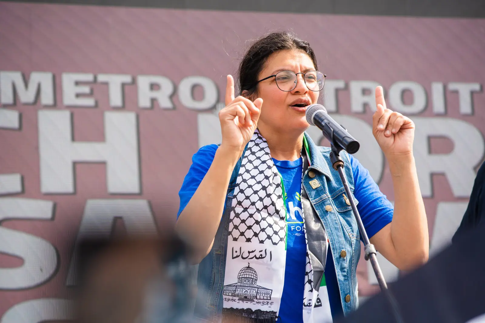 U.S. Rep. Rashida Tlaib (D-Detroit) speaks at the Second Annual Metro Detroit March for Jerusalem Palestine rally, commemorating 74 years of the Nakba, in Dearborn, May 15. Photo: Imad Mohamad/The Arab American News