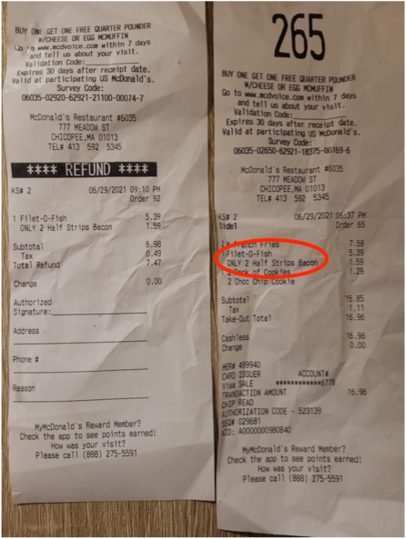 Unbeknownst to Alahmar, her receipt said “ONLY 2 Half Strips Bacon,” which is the normal amount given to customers on request.